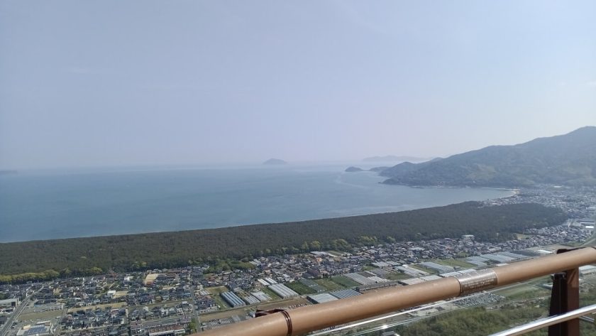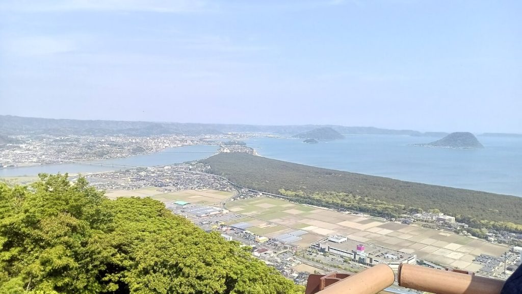 最後の観光地で行った場所は、ホテルから車で30分の鏡山展望台。この展望台からは唐津湾や唐津城そして虹の松原が望めて、最高でした。