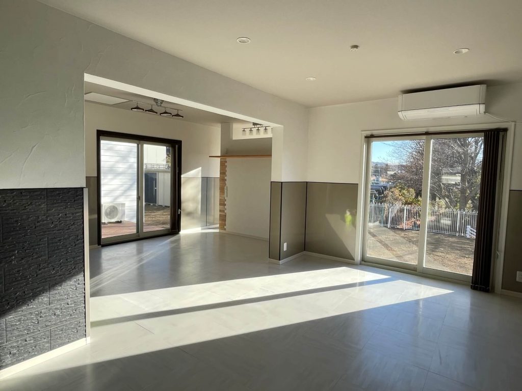 広々としたLDKは明るい雰囲気。そして、テラスや庭へそのまま出られる造りになっていて、開放感は抜群です。ちょっと外の空気を吸いたいリフレッシュのひとときや、天気のいい日は椅子を出してコーヒーを飲むなど、使い方はさまざま。子どもやペットが庭で遊ぶ様子を室内から見守れるなど、室内と屋外がゆるやかにつながる心地よさも魅力です。