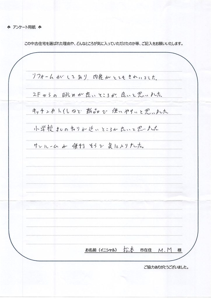 松本市在住M.M.様 リフォームがしてあり、内装がとてもきれいでした。 2Fからの眺めが良いところが、良いと思いました。 キッチンやトイレなど新品で使いやすいと思いました。 小学校までのキョリが近いところが良いと思いました。 サンルームが便利そうで気に入りました。